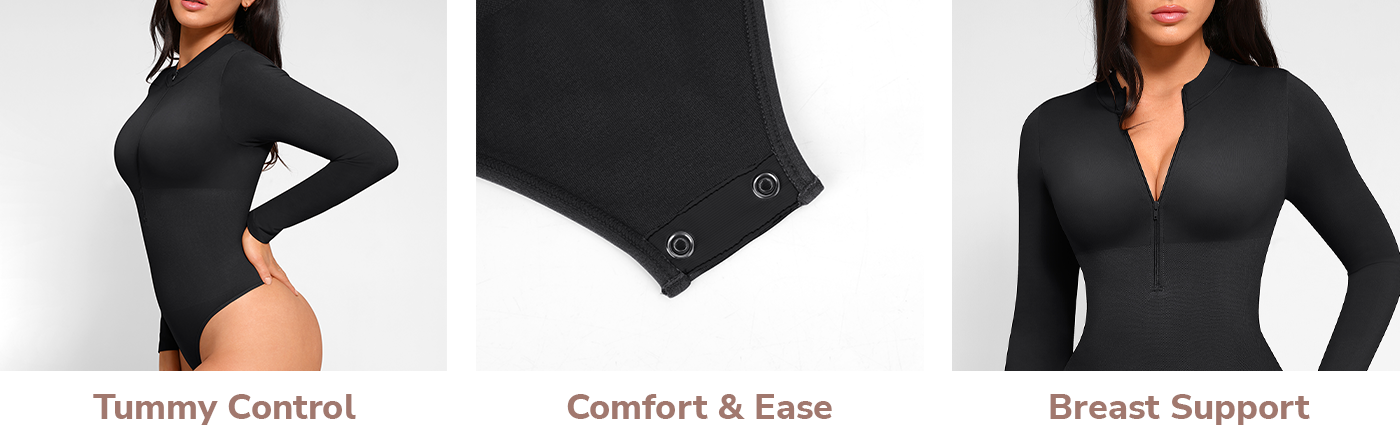 Our Zip Mock-Neck Longsleeve Bodysuit perfectly sculpts your body particularly in the waist and abdomen. The double layer fabric technology tucks your tummy and trims your waist while still allowing for great movement and comfort. It is fashionable and goes with any classic style.