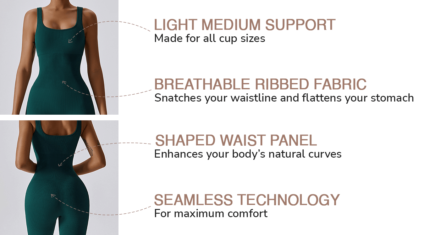Made for workouts, brunch, and everything in between, our Ribbed Seamless Jumpsuit is made to enhance and complement your natural figure while maintaining comfort. With elastic waist design for smooth sculpting, seamless shaping for flattering fit, and ribbed fabric made with 87% Nylon and 13% Spandex.