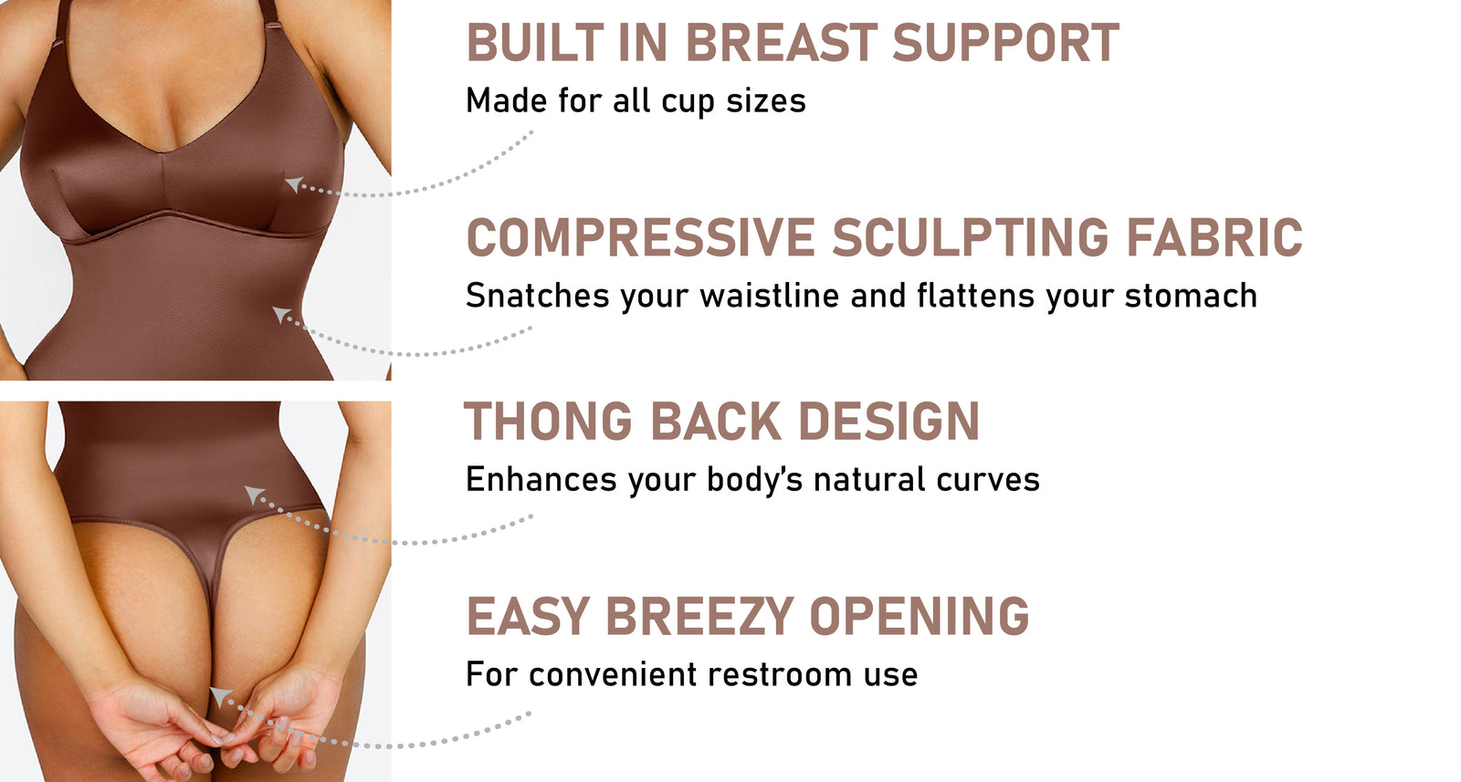 Crafted to accentuate your natural curves and refine your inherent silhouette. This V-Neck Sculpting Satin Thong Bodysuit features a deep V-neck design with a seamless thong-style back. Best paired with Freddy jeans, shorts, cardigans, and various everyday outfits.