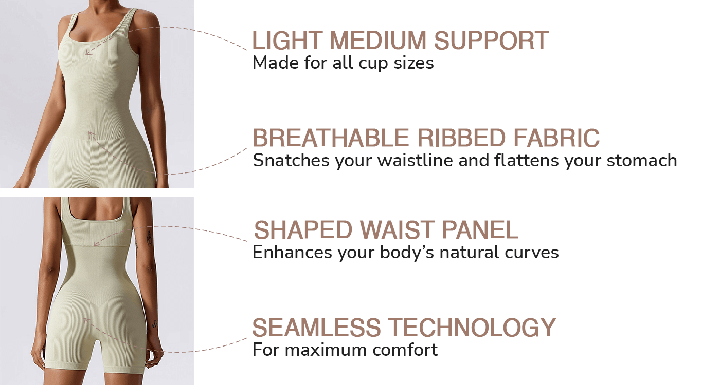 Made for workouts, brunch, and everything in between, our Ribbed Seamless Romper is made to enhance and complement your natural figure while maintaining comfort. With elastic waist design for smooth sculpting, seamless shaping for flattering fit, and ribbed fabric made with 87% Nylon and 13% Spandex.