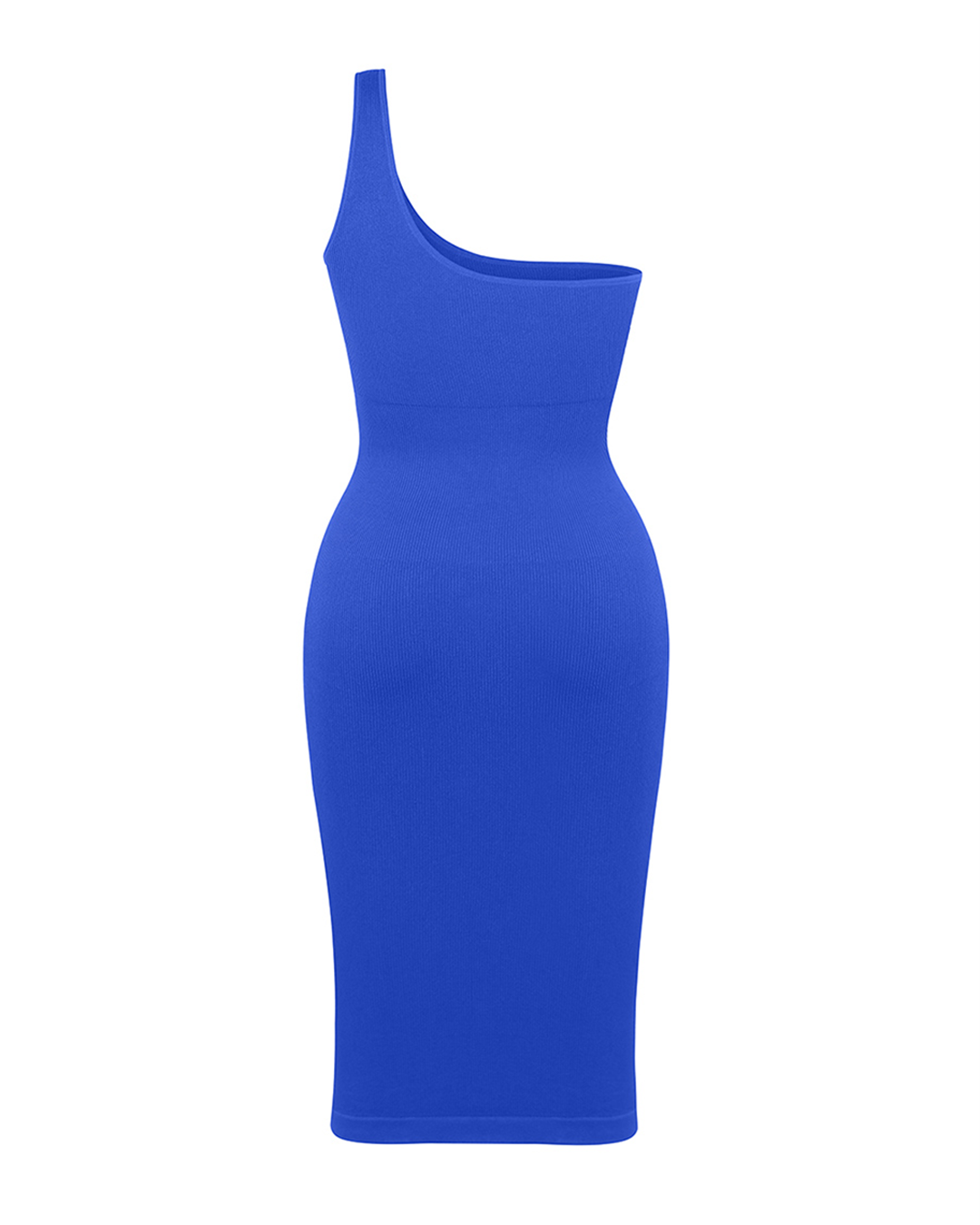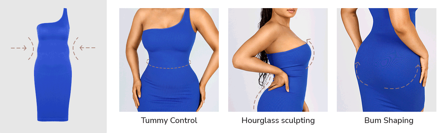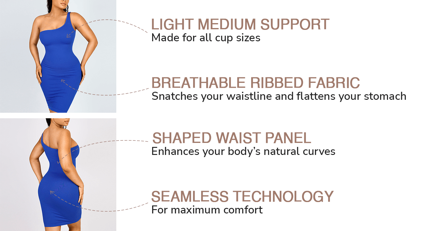 Introducing our Asymmetrical Bodycon Dress designed to enhance your natural curves with seamless sculpting technology. Embrace style and comfort with its sleek asymmetrical neckline and body contouring design. Whether you're jet-setting, hitting the town, or enjoying a romantic evening out, this dress promises a chic and effortless look. Elevate your wardrobe with the perfect blend of comfort and shaping support.