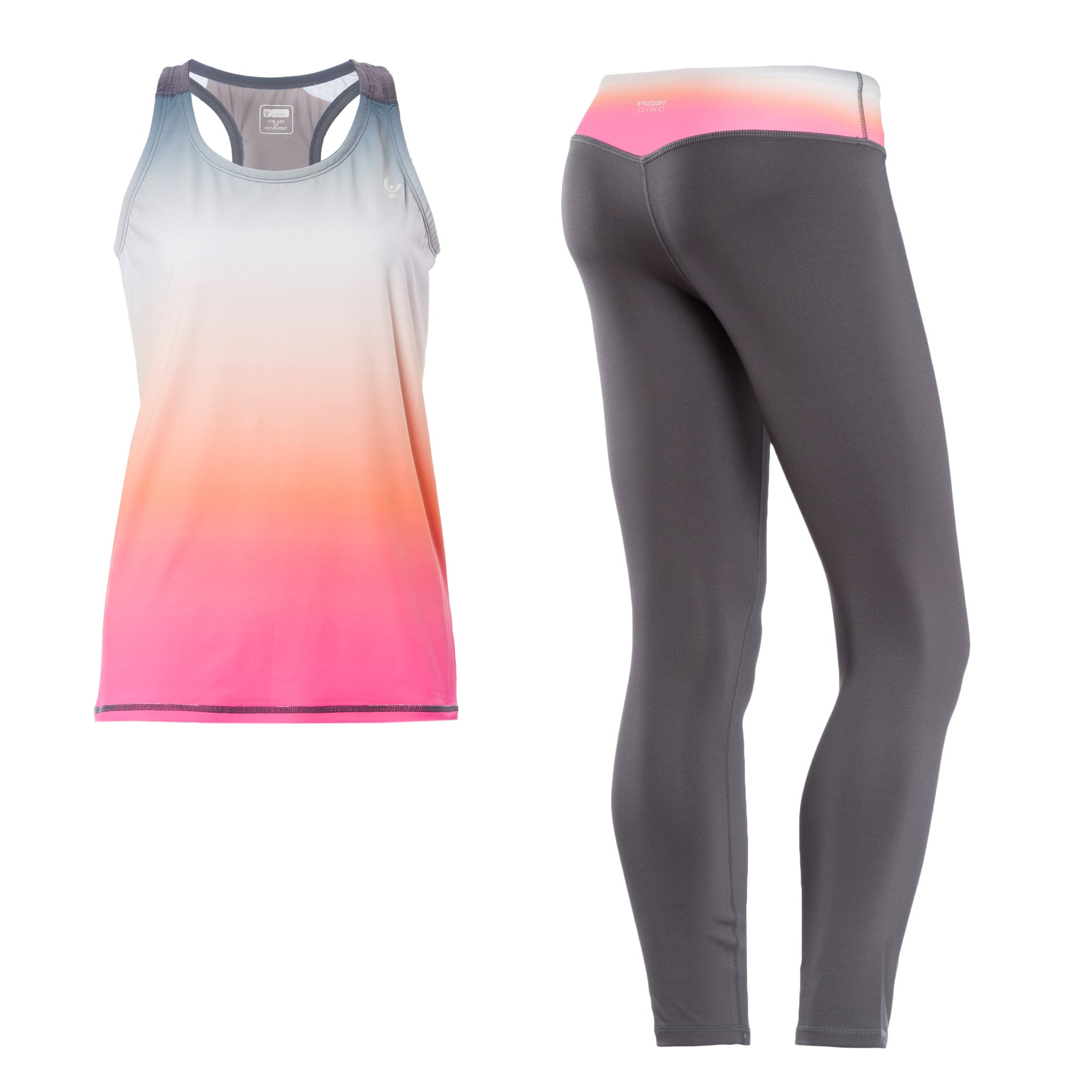Freddy's new SuperFit creation uses its Patented D.I.W.O fabric to help keep dryness in and wetness out as you sweat. The ankle length pant comes with a beautiful rainbow tank to give you a complete look that is ideal for all types of fitness enthusiasts no matter how intense the activity. From mountain biking to martial arts, dance to yoga; the Freddy Sport range will be your new fashion meets fitness must have.