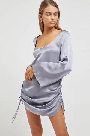 This sexy dress is a similar design to our much-loved Turn Back Time Dress, but with a sleek and silky fabric feel. Featuring long bell sleeves, a statement low scooped back and mid-thigh adjustable ruched sides. Pair it with a pair of tights and knee-high boots to slay this fall.