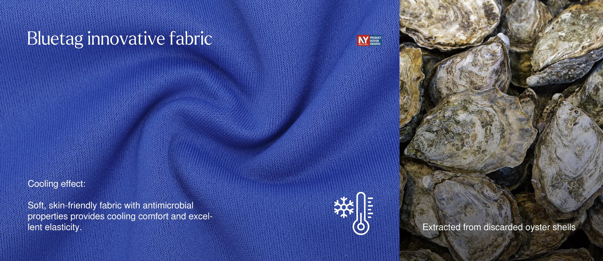The Bluetag collection is made with innovative fabric and is skin-friendly, providing a cool and comfortable feel. Using premium collagen protein extracted from discarded oyster shells. Lightweight, odor-resistant, and naturally moisturizing